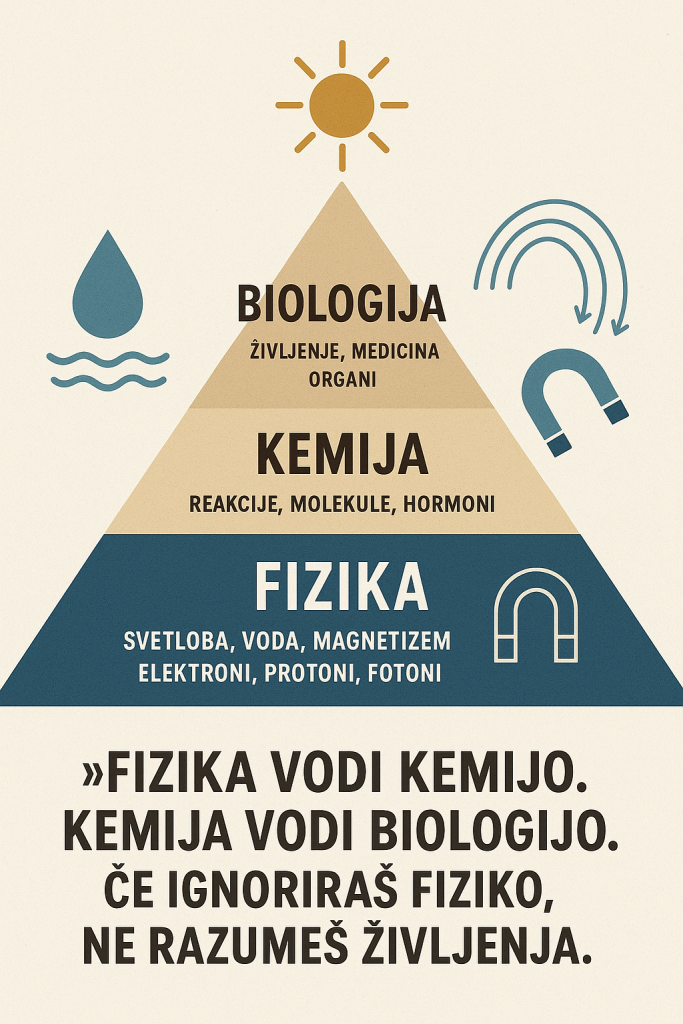 Večina moderne znanosti in medicine je zgrajena na napačni hierarhiji. V šolah učijo, da je biologija nad kemijo, kemija pa nad fiziko – kot da je življenje posledica nekih biokemijskih reakcij, ki jih opisujemo s formulami in encimi. Ampak to je narobe obrnjena piramida.