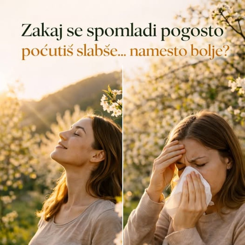Spomladanski premik ure ne vpliva samo na spanec in energijo – zelo pogosto se v tem času začnejo kazati tudi težave z estrogenom in alergijami. Zakaj? Ker telo izgubi stik s pravim časom dneva. Jutranja svetloba se zamakne, večeri postanejo daljši in bolj “umetno osvetljeni”, kar zmede možganski časovnik. Posledično se poruši signal za hormone – estrogen se lahko slabše razgrajuje in začne “krožiti”, hkrati pa se spomladi naravno poveča tudi histamin (imunski odziv). Zato veliko ljudi v tem obdobju opazi napihnjenost, PMS, nihanje energije, težje hujšanje ali izrazitejše alergije. Ne zato, ker bi bilo telo “pokvarjeno”, ampak ker ni več usklajeno z okoljem.